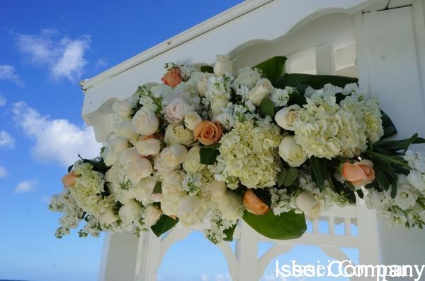 ガゼボ装花は、白ベースでフワフワ感を出し(アジサイを利用しました)、そこにサーモンピンクのバラを挿し色というリクエストでした。