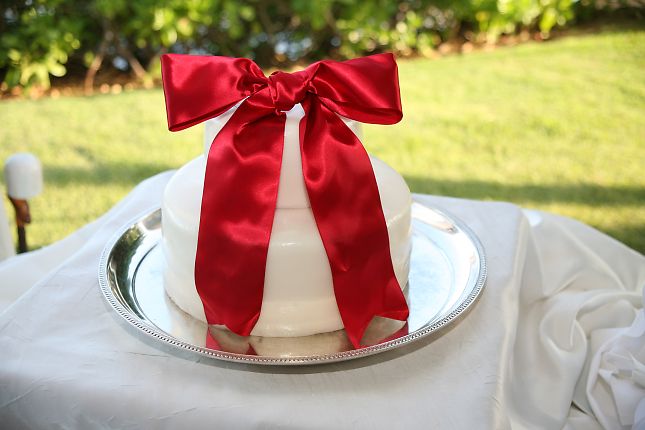 ウエディングケーキは白のフォンダンケーキに日本よりご持参になった赤いリボンを飾りました。