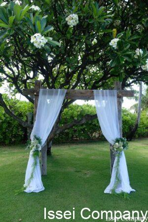 ウェディングアーバーに、マイコさんがいつものリネンと装花をセットしてくれました。