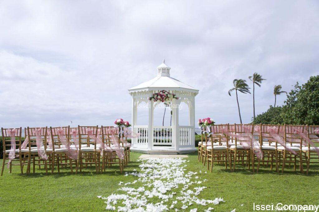 ホワイトオーキッズのバージンロードに、チバリチェアにブラッシュピンクのサッシュ。