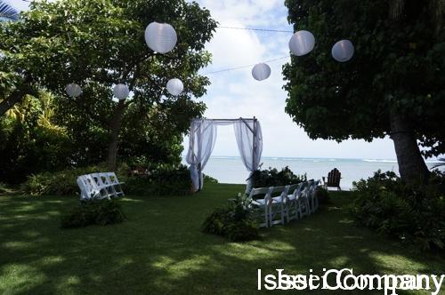 挙式会場は、シンプルにガゼボにリネンと白の椅子。