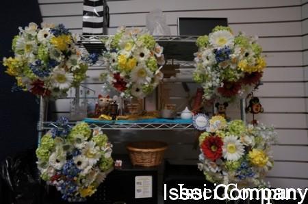 今はやりの、野の花タイプの装花で、ブリキのバケツに入ってます。