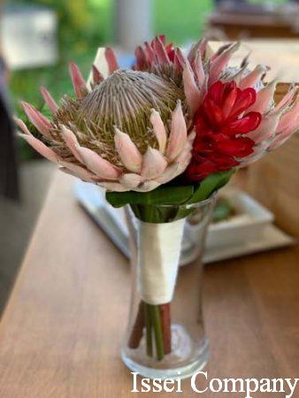 ブーケは、プロテアとジンジャーのトロピカルブーケ。