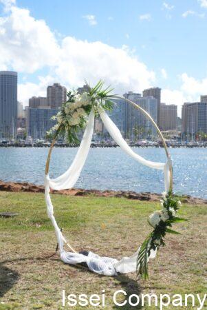 挙式シンボルのアーバーは、ゴールドサークルに、生花装花+ドレープにアップグレード。