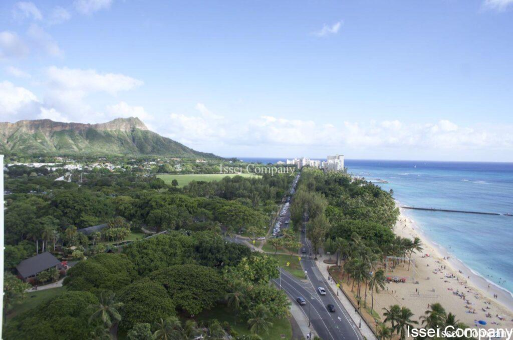 まずテラスからの眺望を、ダイヤモンドヘッド、ワイキキビーチが一望出来ます。