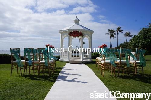 トロピカル系の装花に、チバリチェア+ブルーのチェアサッシュの組合せです。