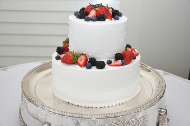 ブーケは、白バラ、シンビジュウム等をつかったシックなキャスケード。