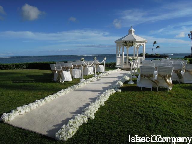 白カバーのイスに。ゴールドのサッシュが、アクセントとなっています。
