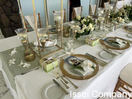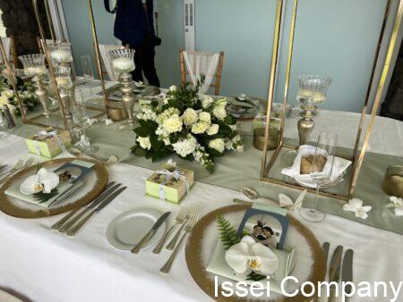 テーブルセッティングは、ゴールドのチャージャープレートに、グリーンのナプキン。