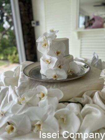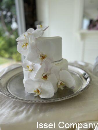 ウェディングケーキは、胡蝶蘭をあしらった豪華なものです。