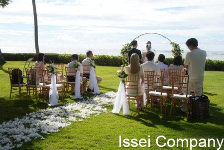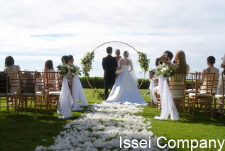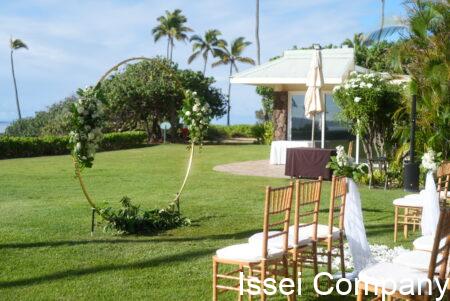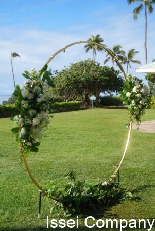 カハラの風の強さ、装花(豪華で大きい)を考慮し、2セットをアーバーを使って、強度を高めました。