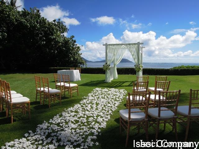 レセプションはプルメリアビーチハウスにて。ガゼボの装花も移動して豪華なテーブルになりました。