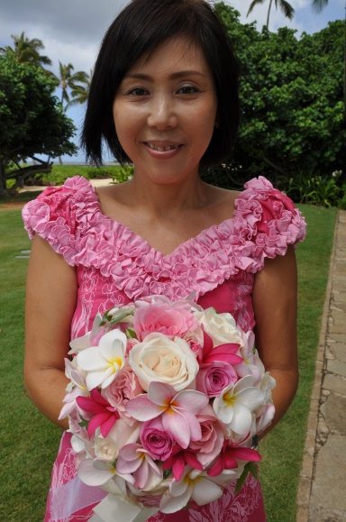 ブーケは、Grubb & Maiko, Design製の ピンク系プルメリアブーケ。