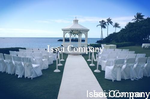 挙式セットアップは、白系のガゼボ装花, 白のチェアカバーと白サッシュ。