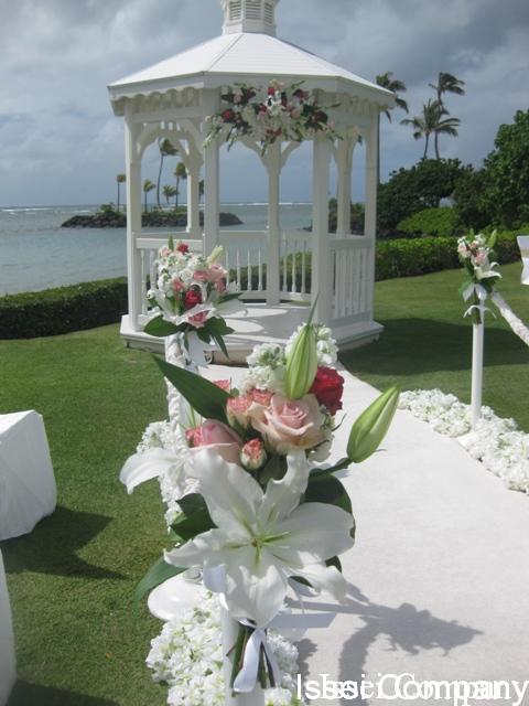 ガゼボ装花は、白をベースに、挿し色はピンク。