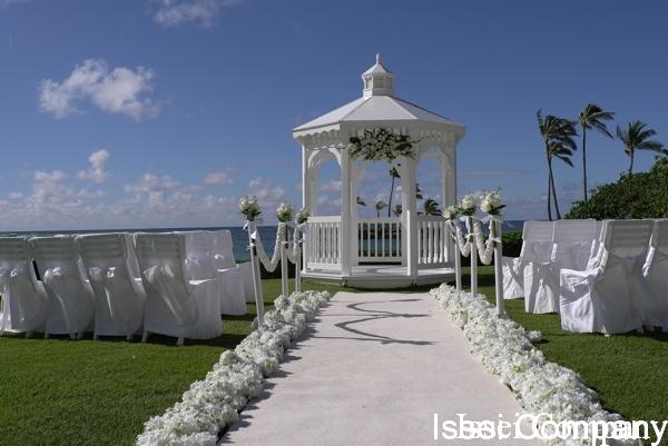 エレガントな、いかにもカハラ・ウェディングというセットアップ。