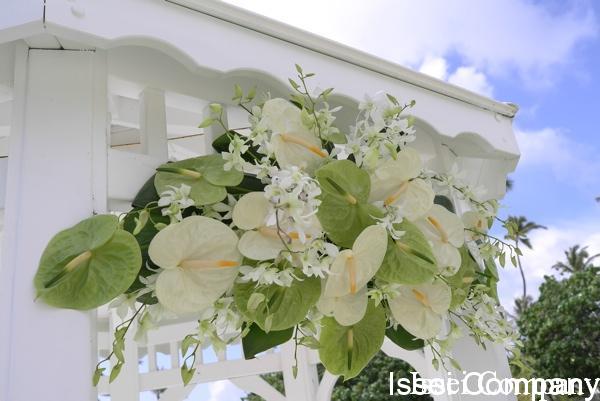 ガゼボの装花は、白とグリーンのトロピカル系でした。