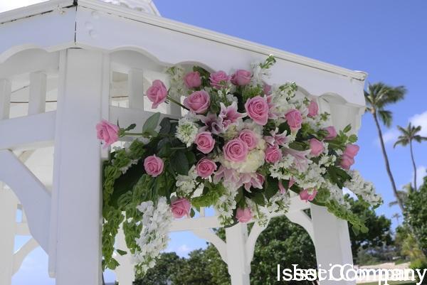 ガゼボ装花は、白とピンクのグラデーション。