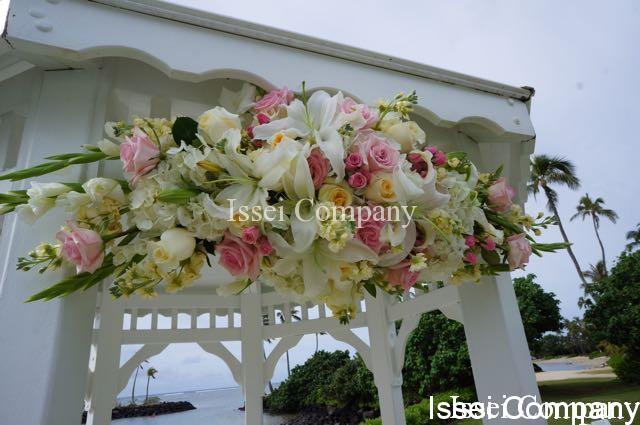 ガゼボの装花は、白ベースにピンクとかイエローの差し色。