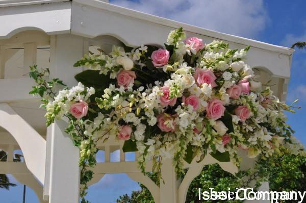 白バラでベースを作り、淡いピンクのプルメリアで全体を作った、これも豪華なブーケです。