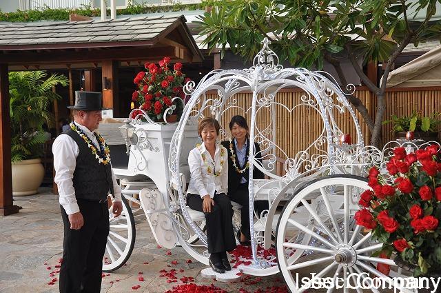 カハラホテルの車寄せに白い馬車が止まっていました!シンデレラの馬車です!しかも赤いバラが飾られて美しい!おじさんが「お姫様ようこそ」と手招きしています。