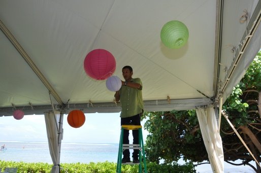 テント内に、細いロープを”ピン”と張り、そこにランタンを設置していくのですが、結構風もあり、約2時間位設置にかかりました。