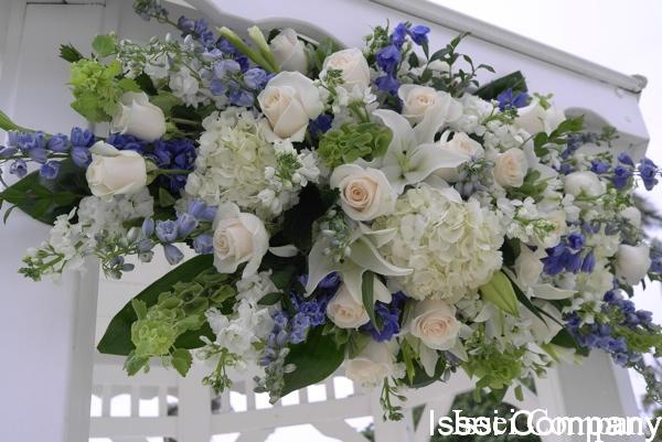 さて、本日のカップル様のガゼボ装花は、白系にブルーの挿し色。