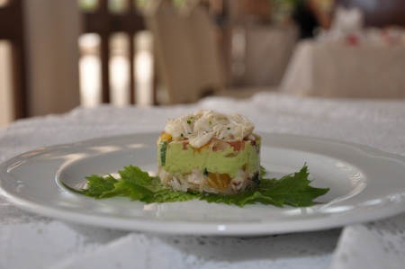 ゼラチンでかためたタコポキに、カニ肉がたっぷりと乗っています。