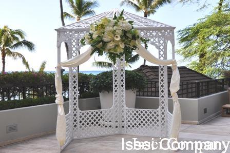 挙式部分ですが、まずガゼボのお花は「アジサイ、アンセリウム、カラー」でのアレンジ。