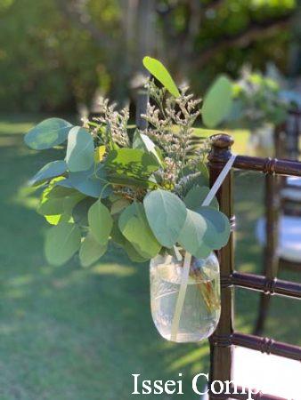 チェアの装花は、少し白のお花もプラスしました。