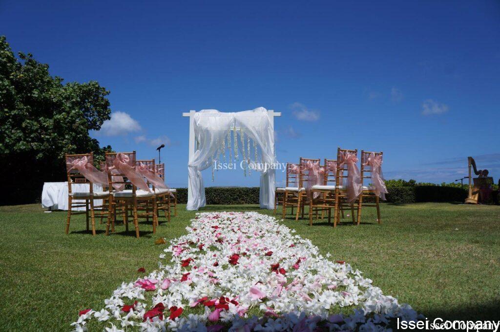 真っ青な空の下。 グリーンのローンに、白のガゼボとドレープに、レイ。