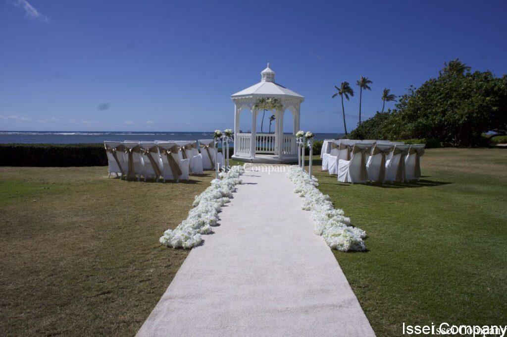 白系のガゼボ装花に、バージンロードと、フラワーロード。