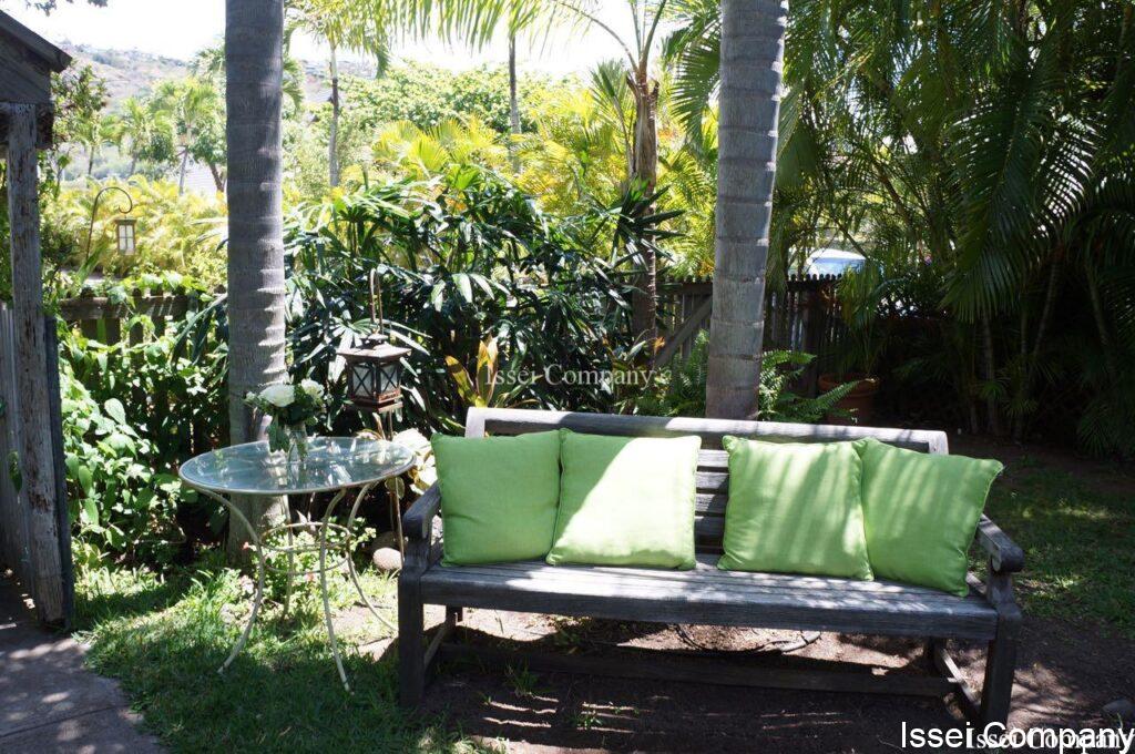 入り口のそばに設定されたベンチには、可愛いグリーンのクッションが。