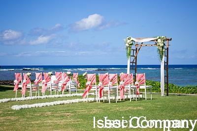 ピンクのチェアサッシュが海の青に映え華やかなセットアップ。