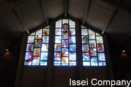 後方上部には、キリスト生誕を表す 大型ステンドグラスが嵌め込まれています。