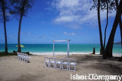 ビーチウェディングでは、セットアップが難しかったのですが、このウェディングには、バンブーのアーチと、白のドレープ、それに白のイスが10脚ついています。