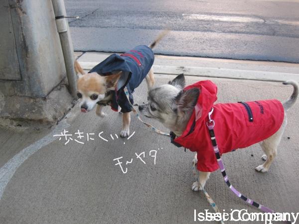 シャワーが結構多いので、本日の散歩はレインコート着用。