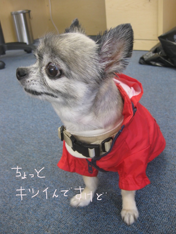 シャワーが結構多いので、本日の散歩はレインコート着用。