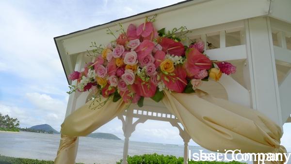 ガゼボの装花は、ピンク系でトロピカルとバラのブレンド型。