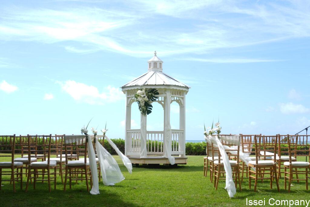 最近、アラモアナ・パークの、マジックアイランドでのウェディングが、人気です。 よく晴れた本日も、挙式がありました。 担当は、プランナーのゆうこちゃんです。 セットアップは、いつもの六角形のアーバーに、白椅子のコンビネーシ
