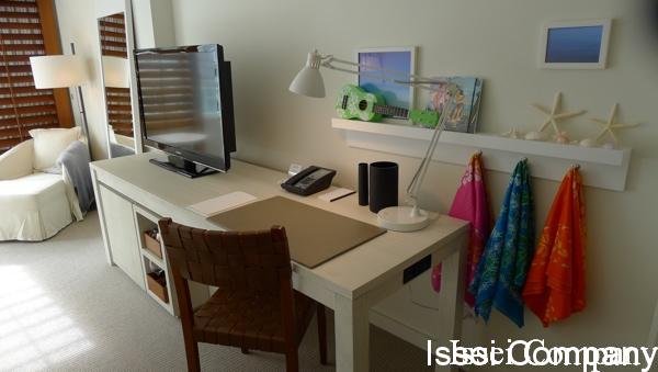 フローリングかな、と思ったのですが、カーペット、ベットやデスクも白基調で、ポップなウクレレとか、パレオなんかが、ディスプレイされてました。