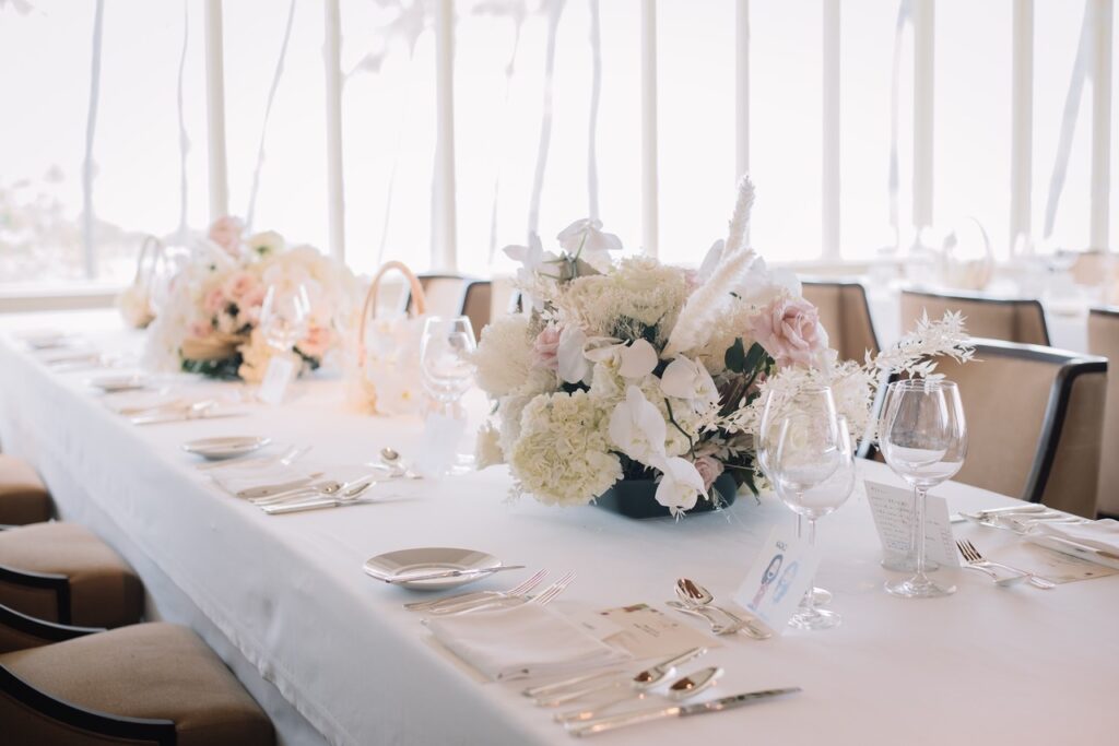 チェアカバーやテーブルデコレーションなどのオプションで、更に素敵に演出することが可能です。ご相談下さい。